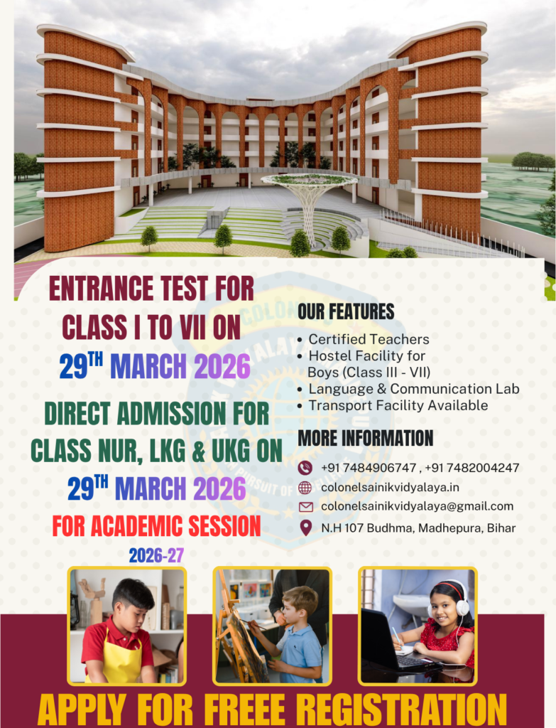 Colonel’s Sainik Vidyalaya, Madhepura is dedicated to empowering the future via cutting-edge education, where discipline, character development, and leadership training are harmoniously integrated with contemporary teaching techniques. The school’s main goal is to develop self-assured, imaginative, and responsible young people who are ready to take on the challenges of a world that is changing quickly. Colonel’s Sainik Vidyalaya, Madhepura guarantees that each student acquires the abilities, principles, and vision required to lead with purpose through technology-driven classrooms, activity-based learning, and a culture of excellence. Our goal is to develop future-ready people who not only achieve academic success but also make significant contributions to society.